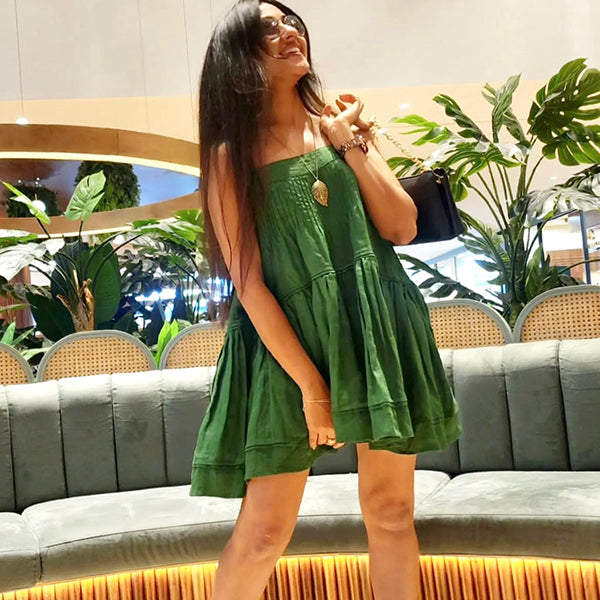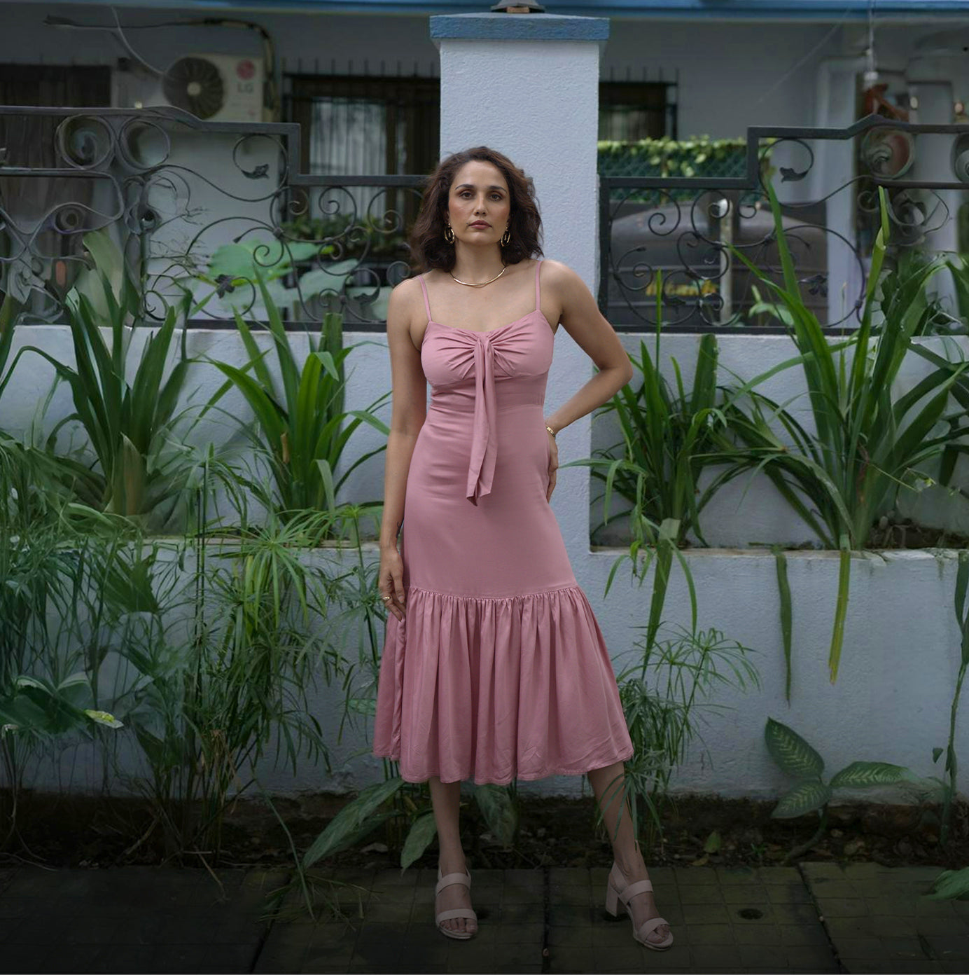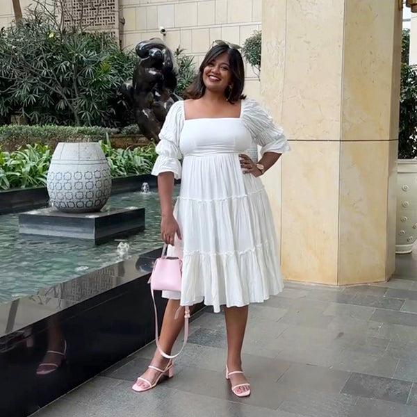 I really love how this dress fits me. The fabric feels soft, and the look is very classy.