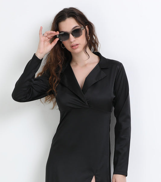 Mileenia Black Cotton Satin Collared Slit Maxi Dress