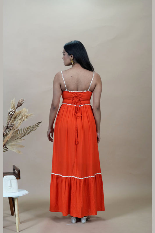 Orange Cotton-Blend Maxi Dress with White Trim