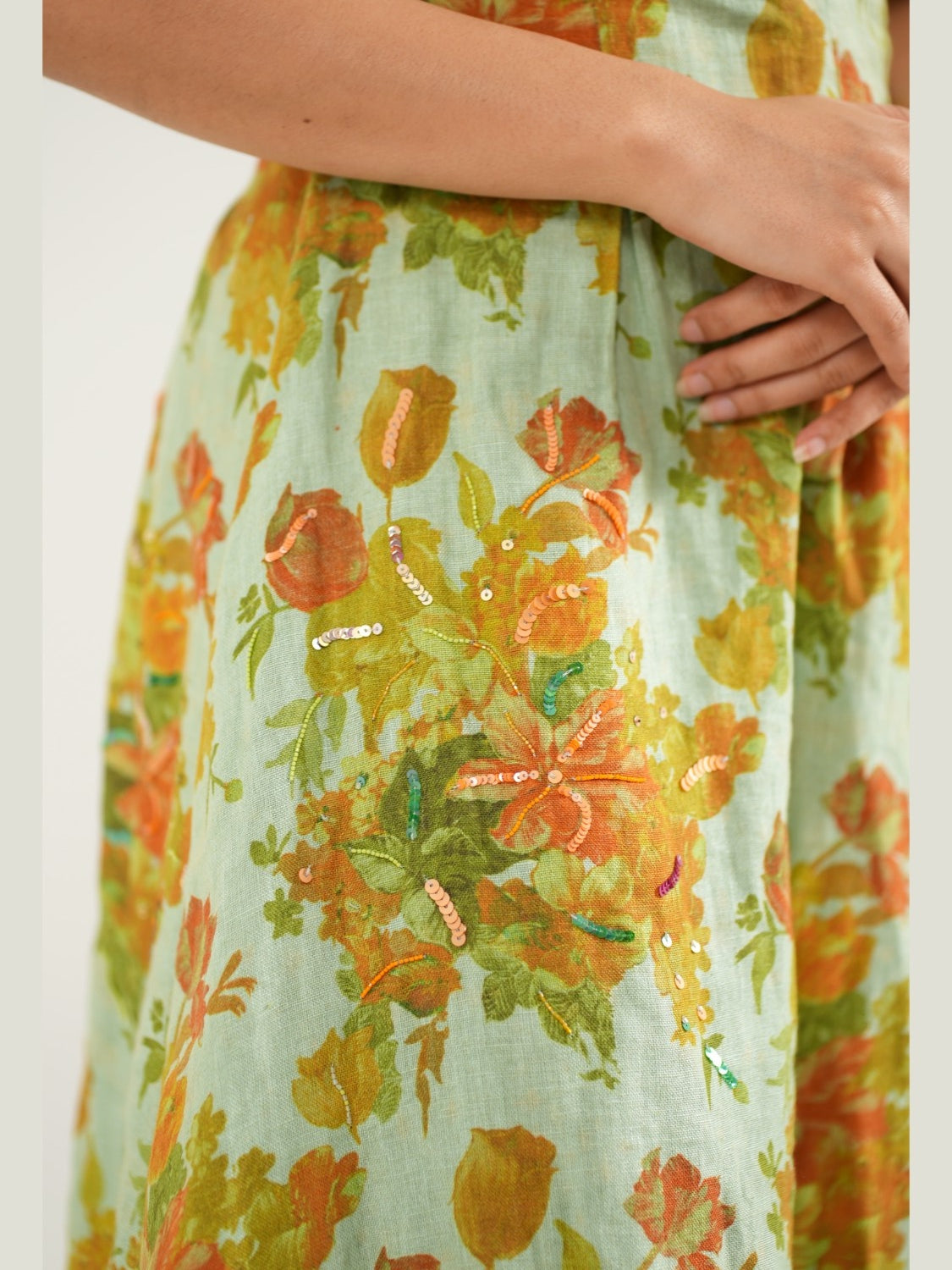 Embrace elegance with this breezy floral maxi dress, designed to bring effortless charm to your wardrobe. Crafted from a soft linen-cotton blend, this dress offers a flattering fit with delicate floral prints in green and orange hues. Featuring a sweetheart neckline, adjustable spaghetti straps, and a flowy silhouette, it's the perfect choice for daytime outings, vacations, or a relaxed brunch with friends.